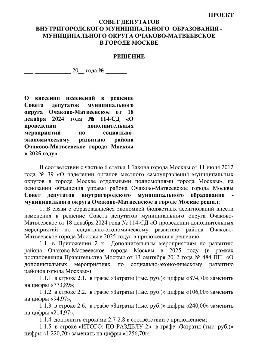 внутригородское муниципальное образование – муниципальный округ очаково-матвеевское в городе москве