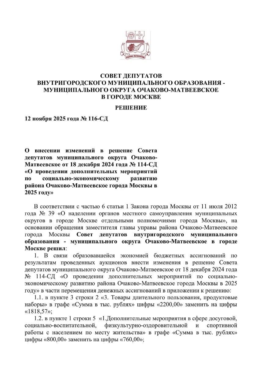 П-Муниципальный округ Очаково-Матвеевское Решение Совета депутатов от 12.11.2025 № 116-СД