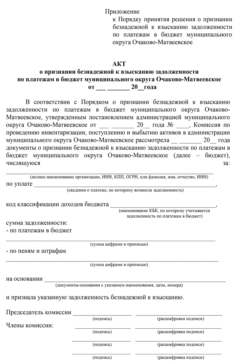 • 27 марта 2017 года № 2-п Об утверждении Порядка принятия решения о признании безнадежной к взысканию задолженности по платежам в бюджет муниципального округа Очаково-Матвеевское