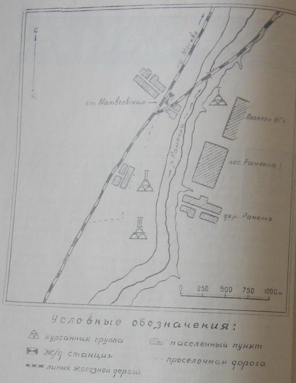 Самые большие курганы (высота до 2,5 метров) находились к западу от д. Матвеевское, на расстоянии полукилометра от станции, прямо посреди колхозного поля. Самая серьезная работа по их раскопкам проводилась в 1953- 1955г. канд ист. наук Г.П. Латышевой: ей было исследовано 17 на левом берегу р. Раменки на территории Матвеевского питомника и у станции Матвеевская.
