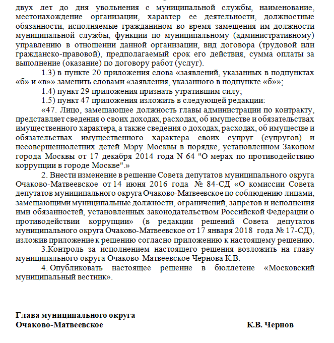 внутригородского муниципального образования – муниципального округа Очаково-Матвеевское в г. Москве