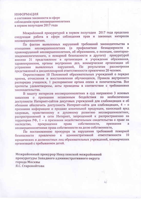 "Информация о состоянии законности в сфере соблюдения прав несовершеннолетних в первом полугодии 2017 года"