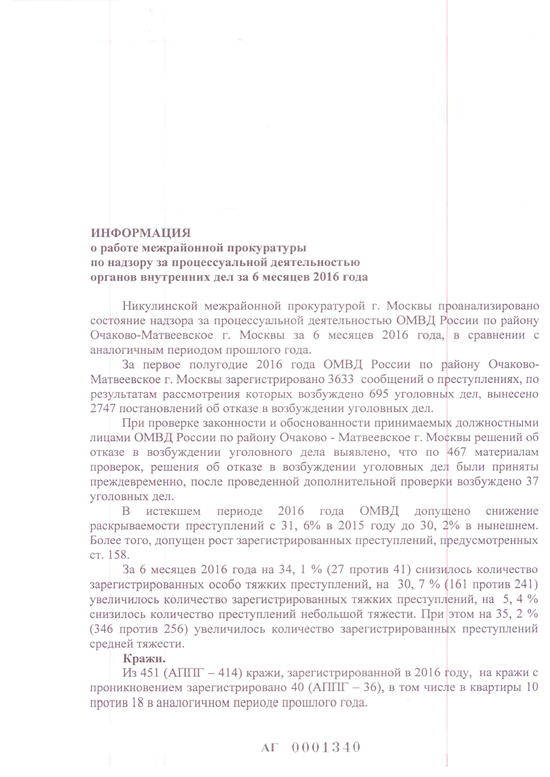 Информация о работе межрайонной прокуратуры по надзору за процессуальной деятельности органов внутренних дел за 6 месяцев 2016 года.
