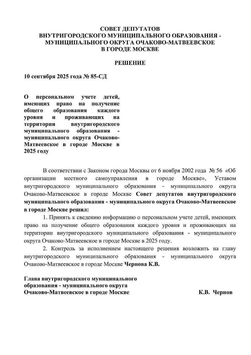 Муниципальный округ Очаково-Матвеевское Решение Совета депутатов от 10.09.2025 № 85-СД