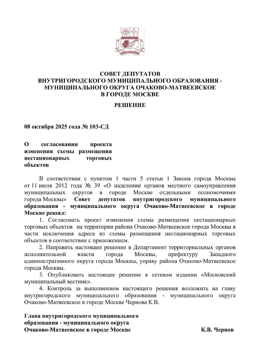 П-Муниципальный округ Очаково-Матвеевское Решение Совета депутатов от 08.10.2025 № 103-СД