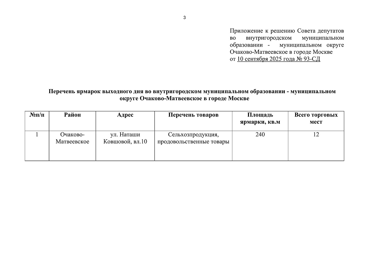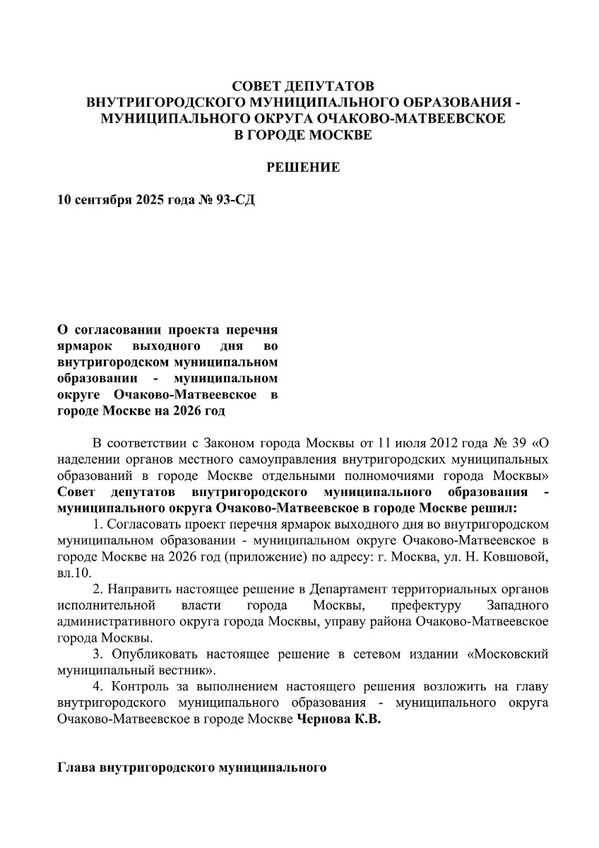 П-Муниципальный округ Очаково-Матвеевское Решение Совета депутатов от 10.09.2025 № 93-СД
