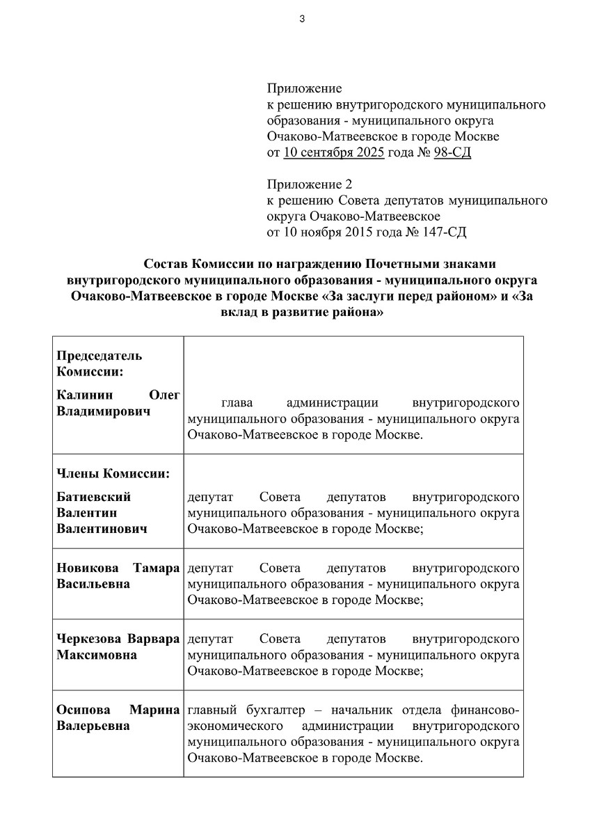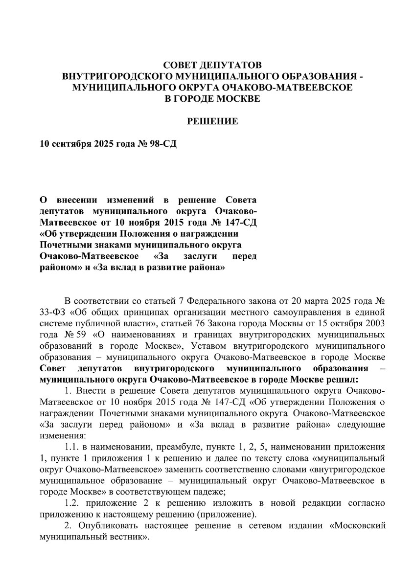 П-Муниципальный округ Очаково-Матвеевское Решение Совета депутатов от 10.09.2025 № 98-СД