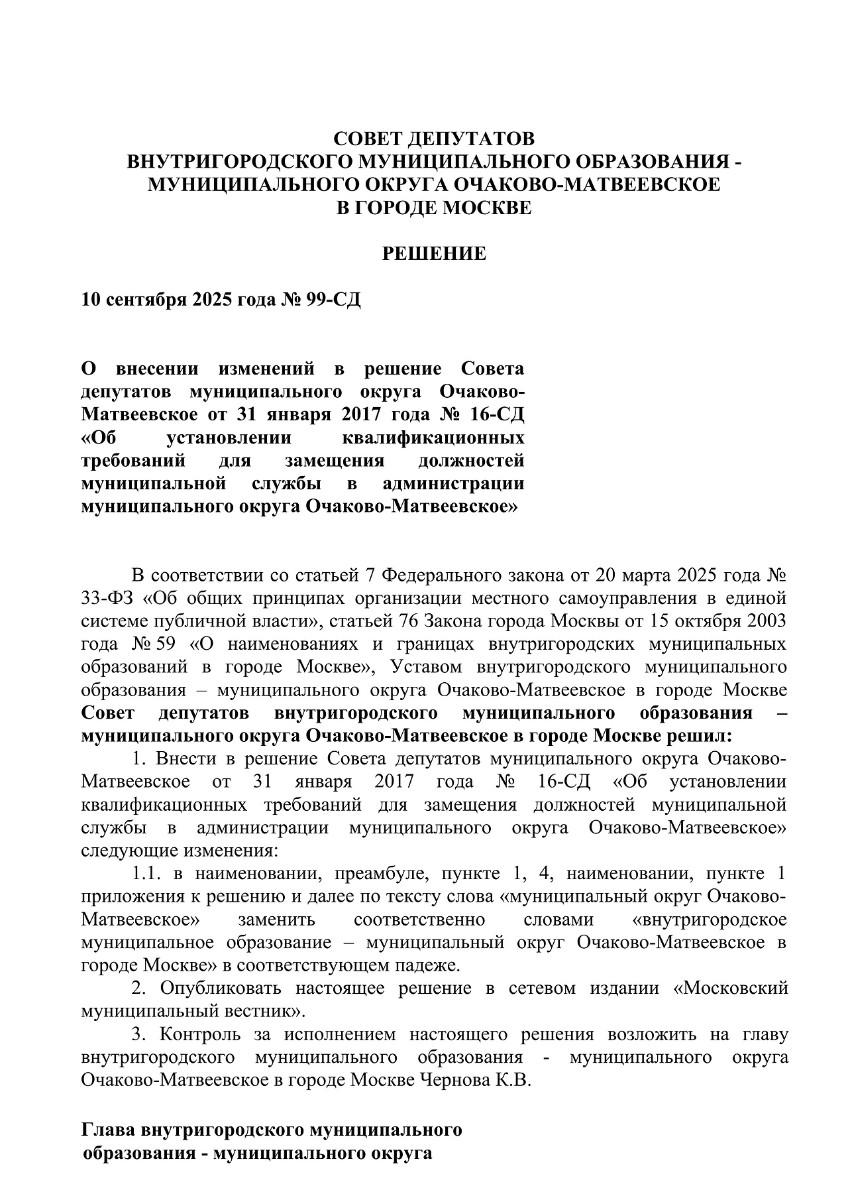 П-Муниципальный округ Очаково-Матвеевское Решение Совета депутатов от 10.09.2025 № 99-СД